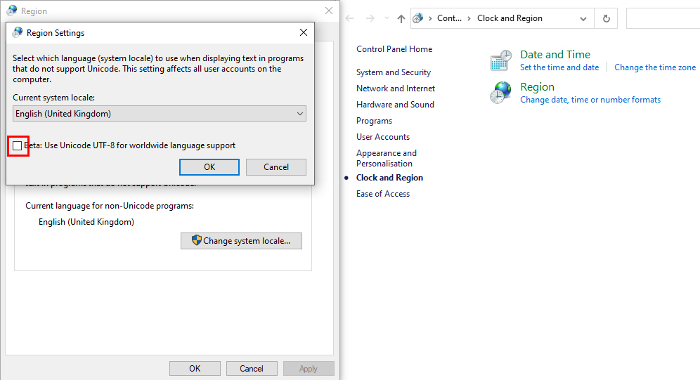- Make sure the checkbox for Beta: Use Unicode UTF-8 for worldwide language support is not ticked and press OK